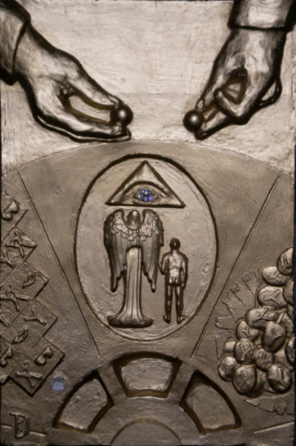 BEZIEHEN Als erstes Werk stellen wir hier eine Medaille vor, die auch chronolgisch unser erstes Werk ist. Wir haben sie kurz nach unserem 50.Geburtstag angefertigt, als uns zunehmend bewusst wurde, dass unsere Berufstätigkeit in absehbarer- nicht allzu ferner Zeit- ihr Ende erreichen würde. Auch der Rest unseres Lebens erschien uns nun ziemlich überschaubar zu sein- spätestens zu diesem Zeitpunkt war die optimistische Halbzeit überschritten. Die dargestellte Medaille kann den Betrachter zur Frage