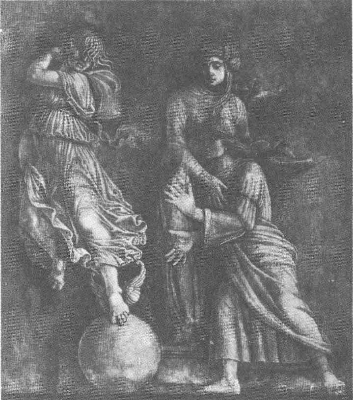 Ein weiterer Hinweis wird in der zitierten Literaturquelle auf das Verhältnis zwischen Tugend und (günstiger) Gelegenheit im vorherrschenden Denken der Renaissance gegeben. Sie befinden sich dort im Gegensatz -"in unversöhnlicher Fehde". Ein Fresco aus der Schule Mantegnas (entstanden nicht vor 1490) stellt dies anschaulich dar: