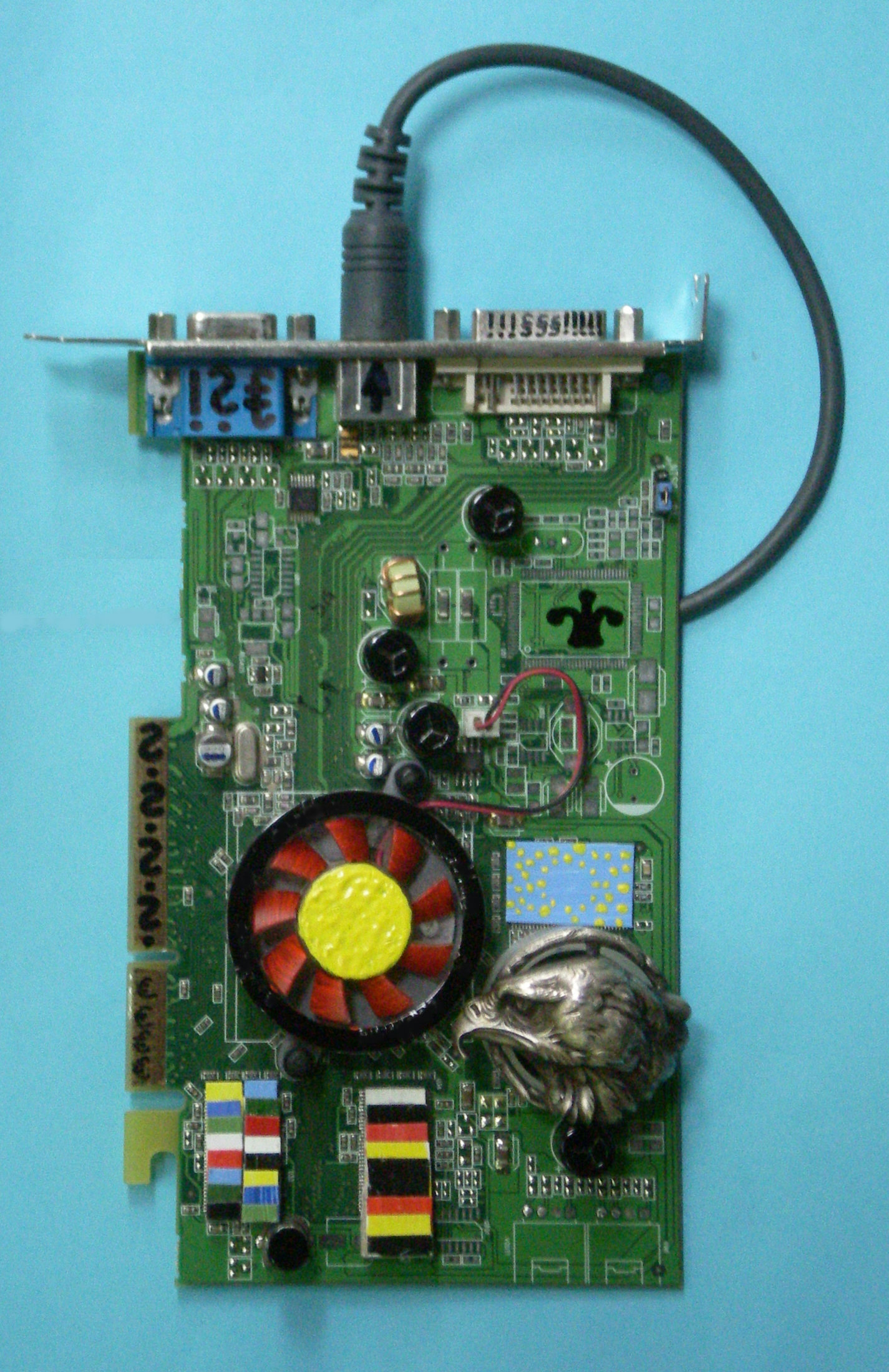 Eine Plakette, die aus einer Grafik-Platine eines PCs durch gezielte Veränderungen und Ergänzungen entwickelt wurde. Sie ist eine Mischform aus figurativen und abstrakten Elementen. Die abstrakten Elemente haben selbst keine bestimmte Bedeutung, sollen aber für das Gesamtsystem den Eindruck der Kompliziertheit und Undurchschaubarkeit für den (zumindest für den nicht fachlich vorgebildeten) Betrachter vermitteln. Andere Elemente sind jedoch sowohl im Einzelnen als auch in Funktion für das Gesamtsystem "Moderne Bürokratie" deutbar.